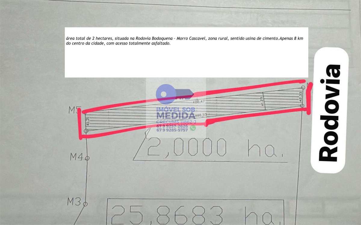 Chácara localizada em Bodoquena/MS, com área total de 2 hectares, situada na Rodovia Bodoquena – Morro Cascavel, zona rural, sentido usina de cimento.